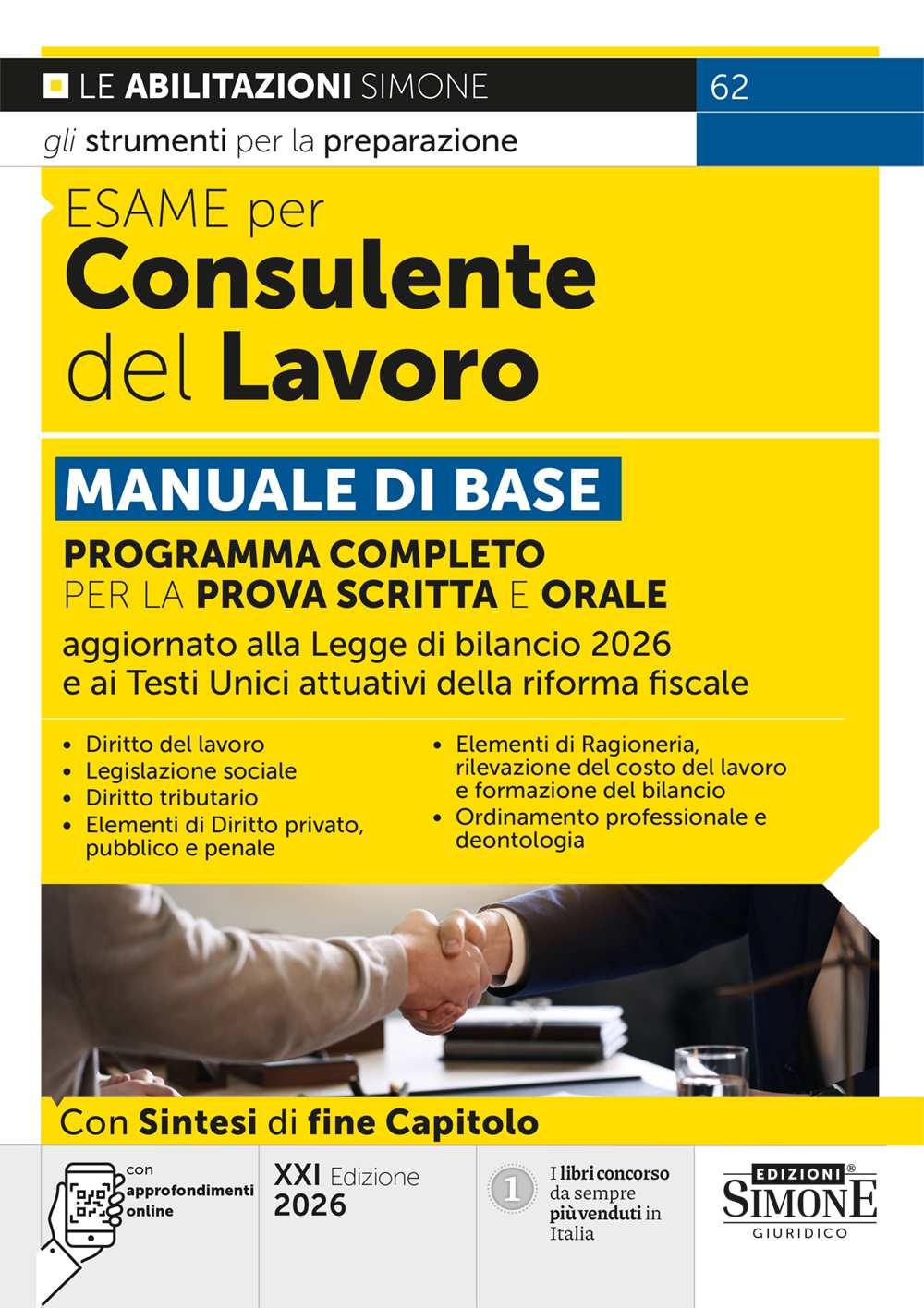 Programma completo per la prova scritta e orale – aggiornato alla Legge di bilancio 2026 e ai Testi Unici attuativi della riforma fiscale – Diritto del lavoro – Legislazione sociale – Diritto tributario – Elementi di Diritto privato, pubblico e penale – Elementi di Ragioneria, rilevazione del costo del lavoro e formazione del bilancio – Ordinamento professionale e deontologia – con approfondimenti online
