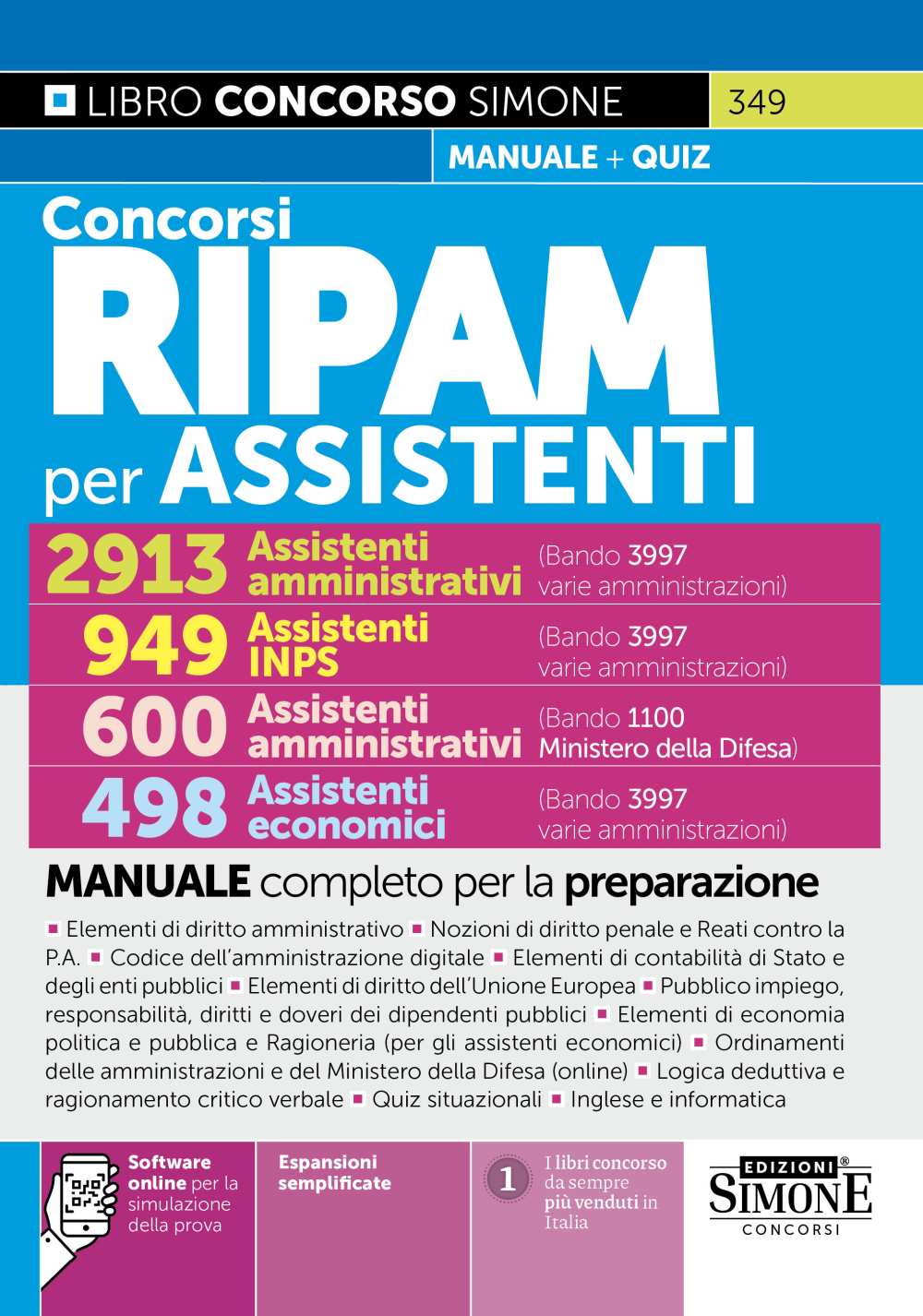 Concorsi RIPAM per ASSISTENTI – 2913 Assistenti amministrativi (3997 varie amministrazioni) – 949 Assistenti amministrativi INPS – 600 Assistenti amministrativi (1100 Ministero della Difesa) – 498 Assistenti economici – Manuale – 349